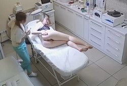 Очкастая девка придя на эпиляцию интимного места разделась, и в одном лифчике легла на кушетку. Напротив нее стояла скрытая камера, и пока девушка лежала раздвинув ноги, светила свою голую пилотку.