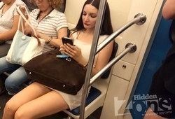 Брюнетка сидела в электричке уткнувшись в телефон, а надето на ней было вызывающе короткое платье. Девушка была стройной и симпатичной, и не замечала что парень ее снимает. В метро на эскалаторе он подсмотрел под платье, чтобы заснять попу и трусики.